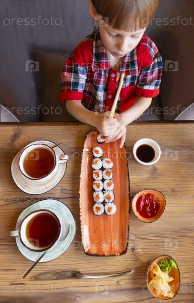 Маленький милый маленький мальчик ест суши в кафе, концепция еды. Вид сверху на ребенка, который ест суши палочками для еды