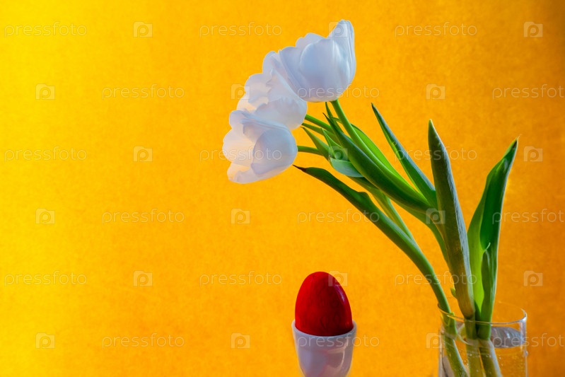 Белый тюльпан и красное пасхальное яйцо на оранжевом фоне