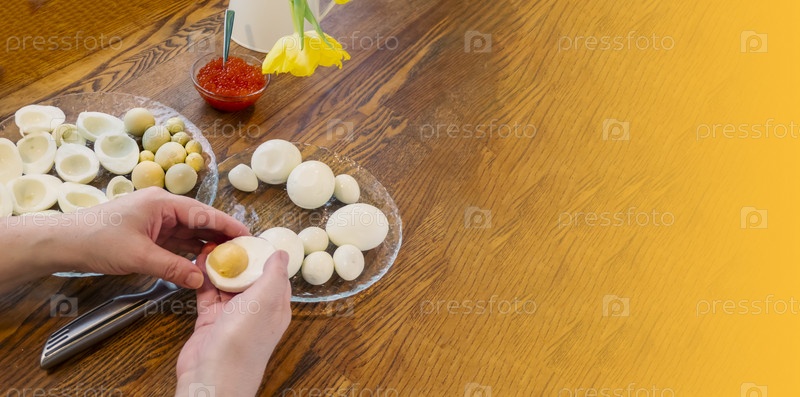 Шаг за шагом. яйцо, разрезанное пополам, для приготовления фаршированных яиц