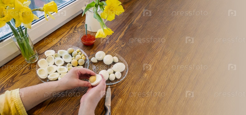 Шаг за шагом. яйцо, разрезанное пополам, для приготовления фаршированных яиц
