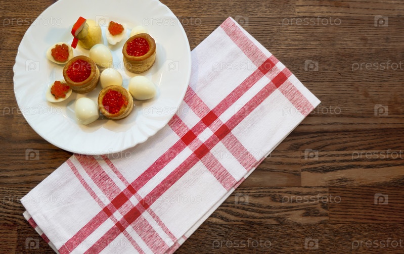 Фон красной икры на деревянной поверхности dsrk. картофель с красными яичками