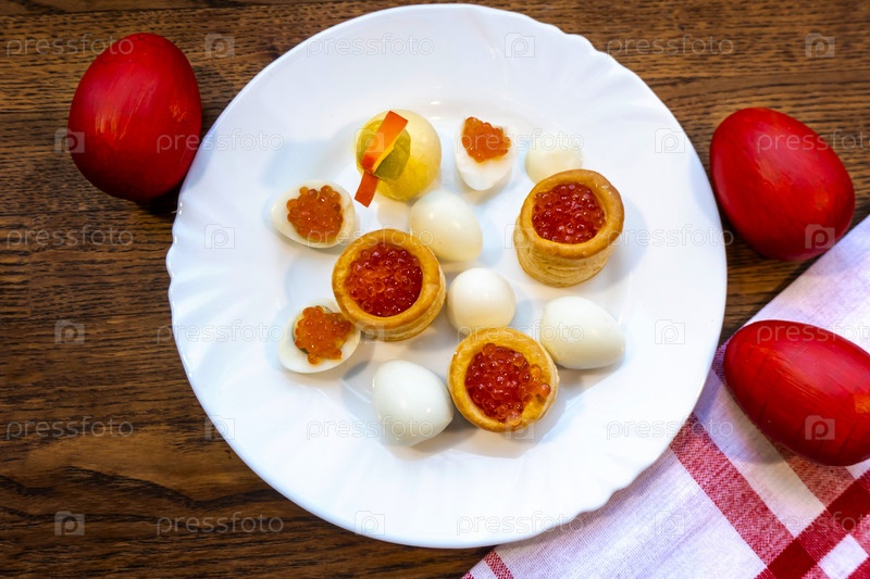 Фон красной икры на деревянной поверхности dsrk. картофель с красными яичками