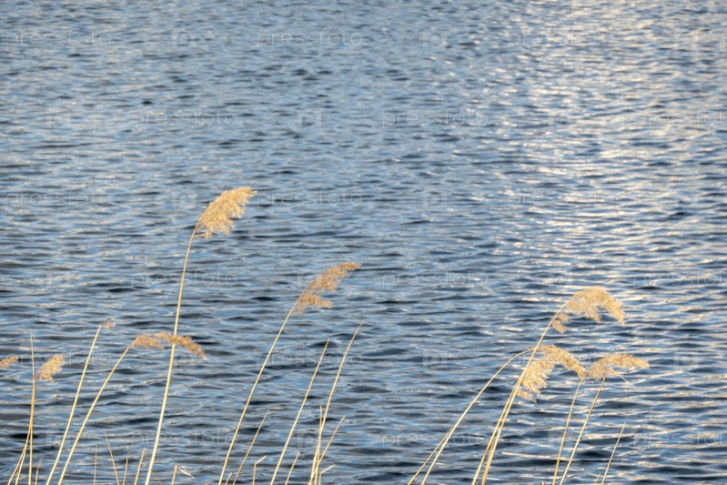 Драматический восход солнца над спокойной рекой весной с изогнутой травой против солнца. Даугава, Латвия