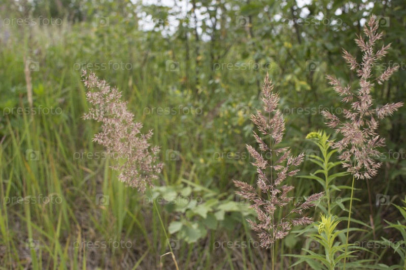 Цветущие колосья сорняков. натуральный газон на ярком солнце