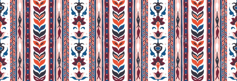 Геометрический дамасский орнамент. Икат границы. Этническая вышивка с листьями и монограммами. Племенная векторная текстура. Бесшовный народный узор в ацтекском стиле. Индийский, скандинавский, цыганский, мексиканский, африканский ковер