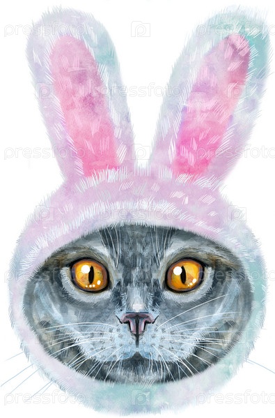 Симпатичный кот в костюме кролика. Кот для графики на футболках. Акварельная британская короткошерстная иллюстрация