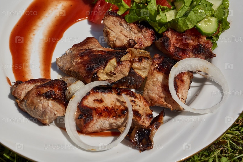 Барбекю с луком, овощным салатом и соусом на тарелке. Обед на газоне. Крупный план