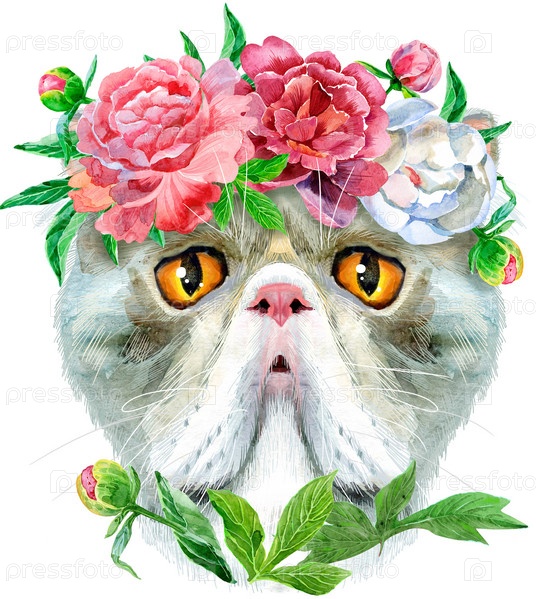 Симпатичный кот в венке из цветов. Кот для графики на футболках. Иллюстрация породы акварельных экзотических короткошерстных кошек
