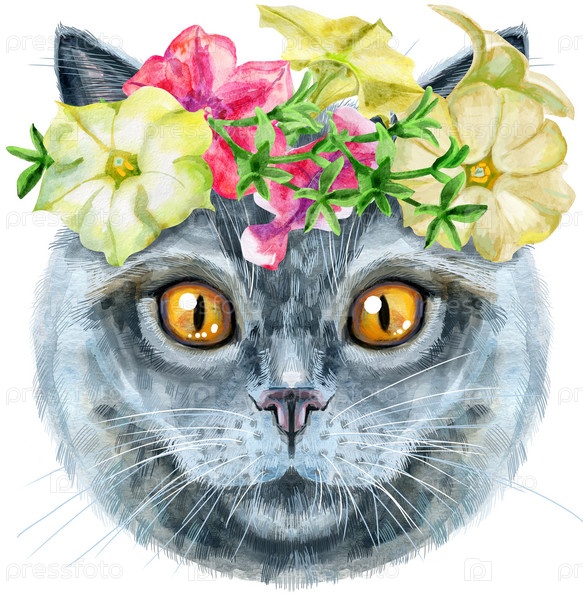 Симпатичный кот в венке из цветов. Кот для графики на футболках. Акварельная британская короткошерстная иллюстрация