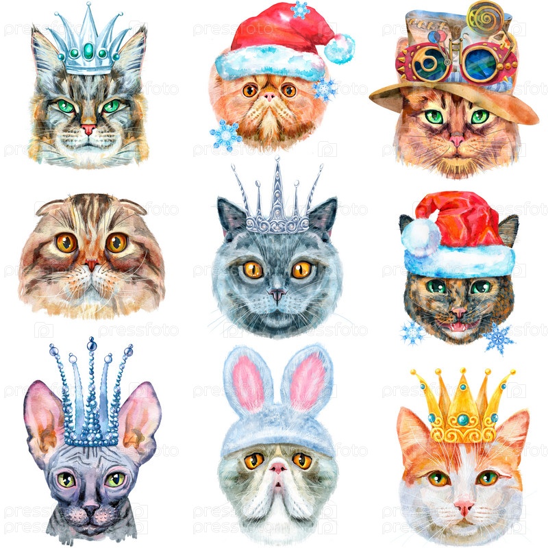 Набор портретов кошек разных пород с аксессуарами. Акварель рисованной иллюстрации