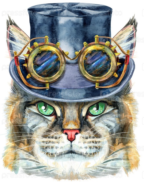 Прекрасный портрет крупным планом кошки Мейн Кун в стимпанк-шапке с очками. Ручной обращается акварель на белом фоне