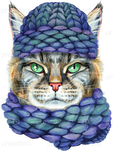 Милый кот в синей вязаной шапке и теплом шарфе. Кот для графики на футболках. Акварельная иллюстрация породы кошек Мейн Кун