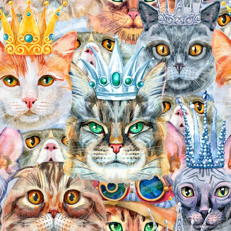 Бесшовный рисунок кошек с различными аксессуарами. Акварель рисованной иллюстрации