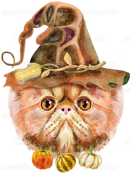 Милый кот в шляпе ведьмы с маленькими тыквами. Кот для графики на футболках. Иллюстрация породы акварельных экзотических короткошерстных кошек