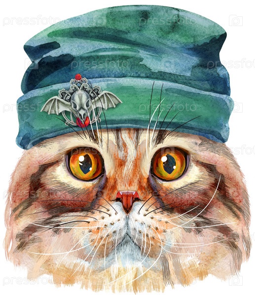 Симпатичный кот в зеленой шапочке. Кот для графики на футболках. Акварель Хайленд вислоухая иллюстрация породы кошек