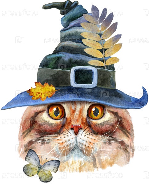 Прекрасный портрет крупного плана хайлендской вислоухой кошки в шляпе ведьмы. Ручной обращается акварель на белом фоне