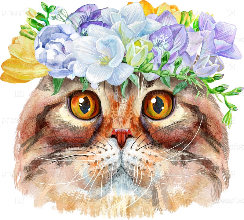 Симпатичный кот в венке из цветов. Кот для графики на футболках. Акварель Хайленд вислоухая иллюстрация породы кошек