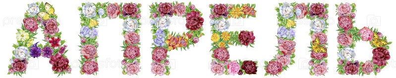 Слово Апрель на русском языке акварельных цветов, изолированная рука, нарисованная на белом фоне, свадебный дизайн, русский алфавит