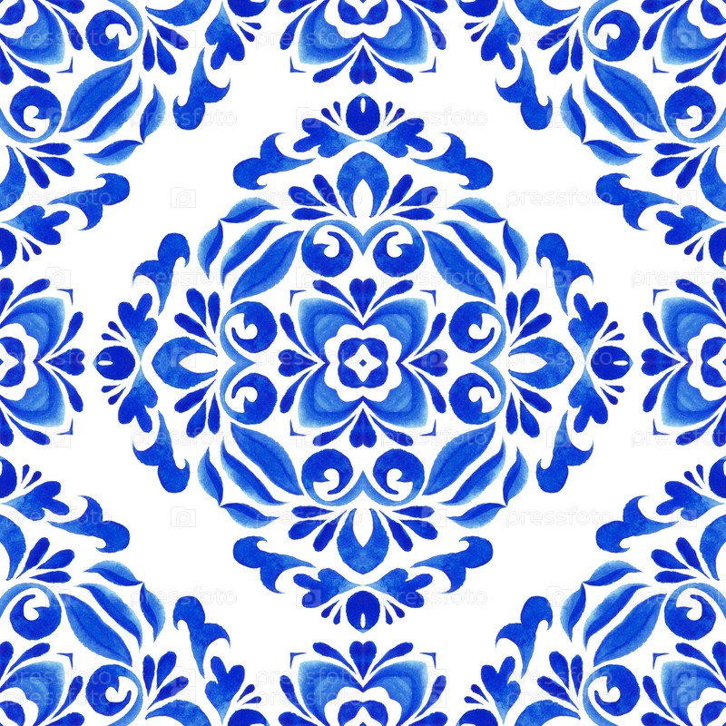 Цветочная сине-белая ручная плитка бесшовная декоративная Великолепная дамасская фоновая акварельная краска