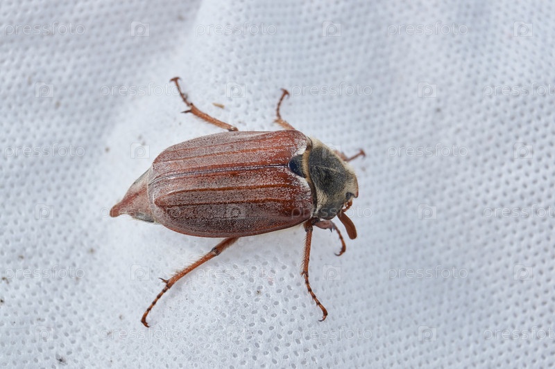 Майский жук ползет в саду по крытому материалу теплиц.Майский жук, или майский жук (лат. Melolontha) род насекомых семейства пластинчатых