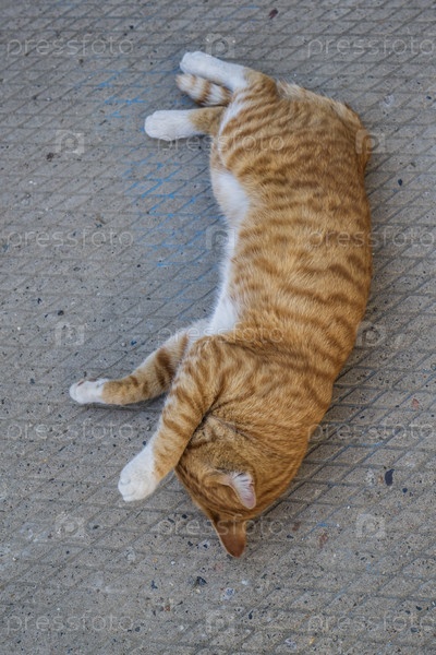 Рыжий кот лежит на земле