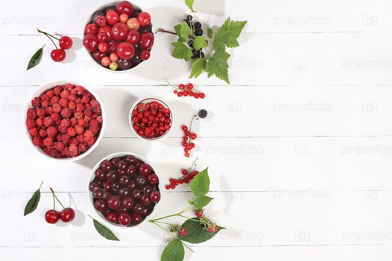 Сбор урожая в деревне, баннер с летней свежей вишней, смородиной и малиной на светлом деревянном фоне с листьями, баннер и реклама магазина, концепция здоровой натуральной пищи, завтрак с ингредиентами, визитная карточка кафе, выборочный фокус