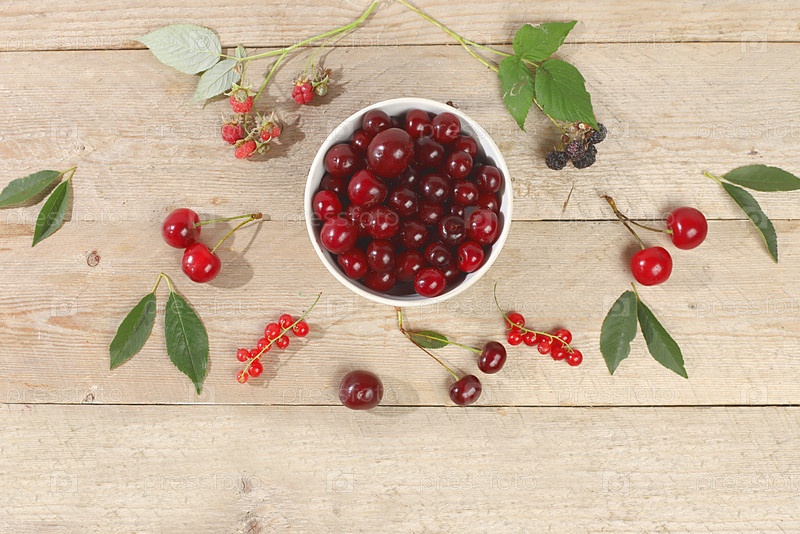 Летние свежие ягоды вишни на деревянном фоне с листьями, деревенский урожай, концепция здоровой натуральной пищи, завтрак с ингредиентами, баннер и реклама магазина, визитная карточка кафе, избирательный фокус