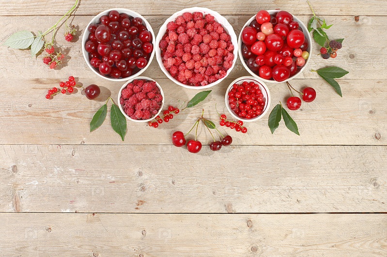Летние свежие вишни, смородина и малина на деревянном фоне с листьями, сбор урожая в деревне, концепция здоровой натуральной пищи, завтрак с ингредиентами, реклама баннеров и магазинов, визитная карточка кафе, избирательный фокус