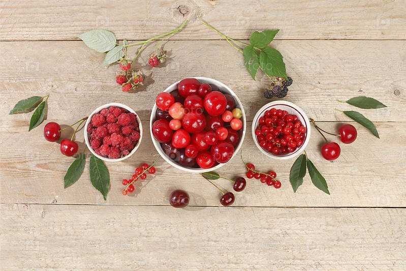 Летние свежие вишни, смородина и малина на деревянном фоне с листьями, сбор урожая в деревне, концепция здоровой натуральной пищи, завтрак с ингредиентами, реклама баннеров и магазинов, визитная карточка кафе, избирательный фокус