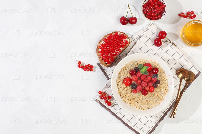 Здоровый завтрак с ингредиентами, овсяный пудинг или каша с малиной, вишней, смородиной, медом и тостами на солнечном столе. Концепция здоровой и натуральной пищи, образа жизни, питания для детей, плоской планировки