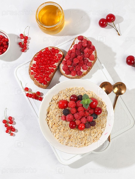 Здоровый завтрак с ингредиентами, овсяный пудинг или каша с малиной, вишней, смородиной, медом и тостами на солнечном столе. Концепция здоровой и натуральной пищи, образа жизни, питания для детей, плоской планировки