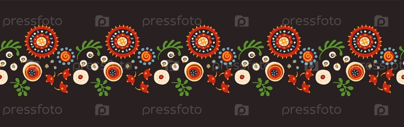 Набор этнических элементов. Бордюр представляет собой полосу с цветами, листьями, ветками, вензелями. Народная вышивка. Славянский, украинский, русский мотив. Хохлома, матрешка, дымковская игрушка. Мексиканский, индийский, цыганский ковер. Вязаное кружево