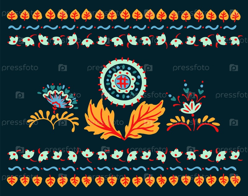 Набор этнических элементов. Бордюр представляет собой полосу с цветами, листьями, ветками, вензелями. Народная вышивка. Славянский, украинский, русский мотив. Хохлома, матрешка, дымковская игрушка. Мексиканский, индийский, цыганский ковер. Вязаное кружево