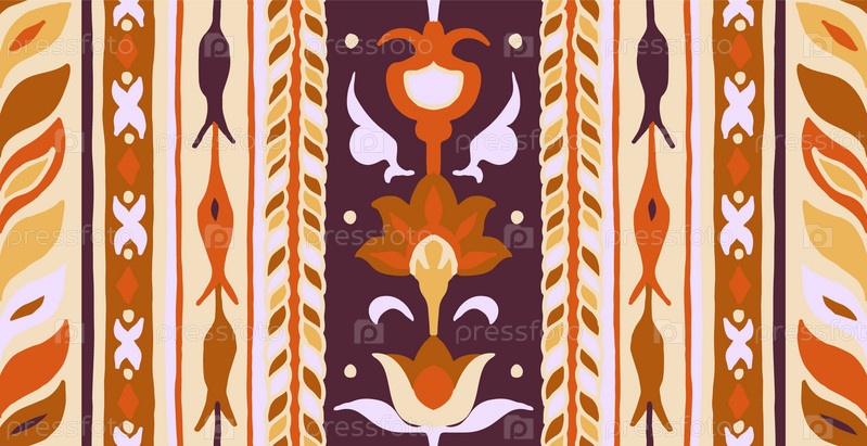 Геометрический дамасский орнамент. Икат границы. Этническая вышивка с листьями и монограммами. Племенная векторная текстура. Бесшовный народный узор в ацтекском стиле. Индийский, скандинавский, цыганский, мексиканский, африканский ковер