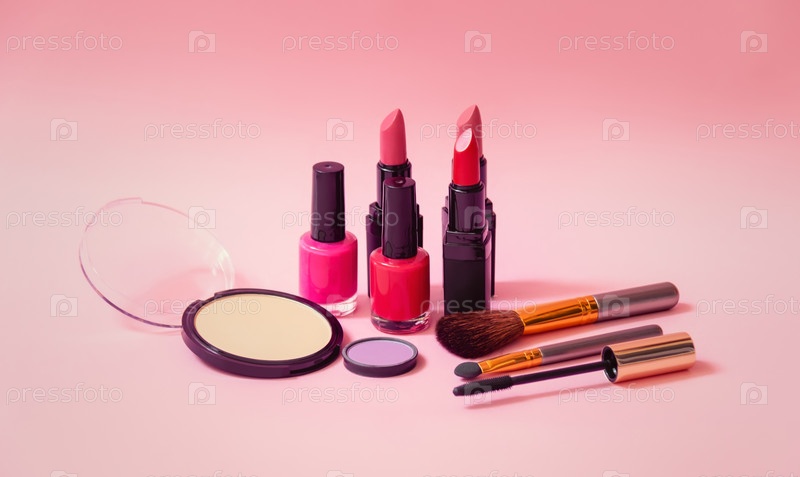 Набор косметики для макияжа, лаки для ногтей и кисти на розовом фоне. Выборочный фокус