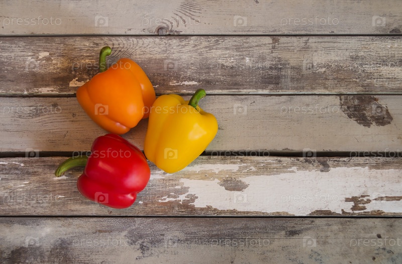 Свежий спелый сладкий перец на фоне старых деревянных. Вид сверху, пространство для копирования