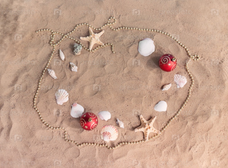 Рамка из елочных шаров, бус, морских звезд и ракушек на песчаном пляже. Празднование Рождества и Нового года