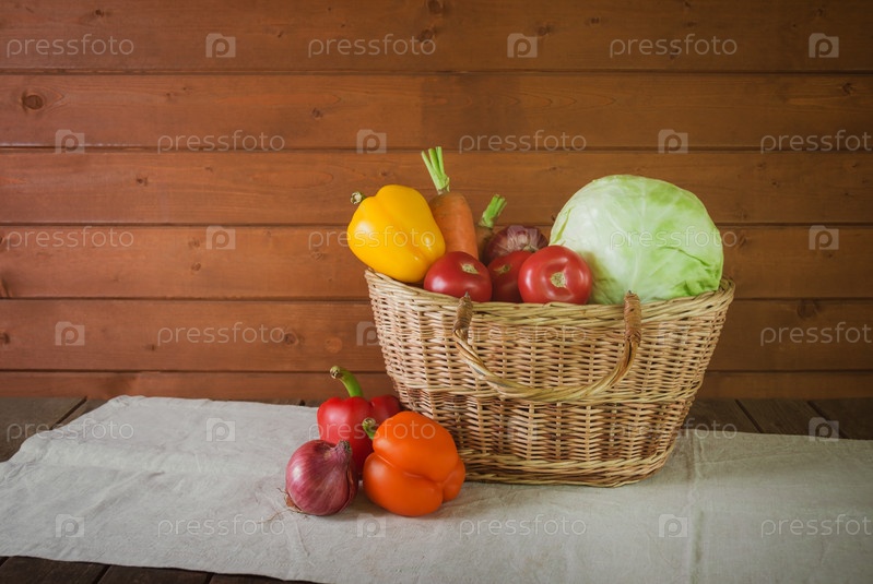 Плетеная корзина с различными свежими сельскохозяйственными овощами на старом деревянном столе