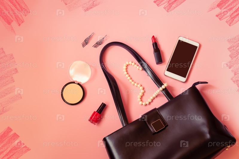 Черная кожаная женская сумка, смартфон, серьги, пудра, помада и лак для ногтей на розовом фоне