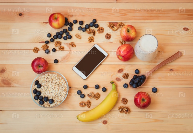 Смартфон окружен стаканом йогурта, овсяными хлопьями в миске с черникой, бананом, грецкими орехами и яблоками. Концепция здорового питания