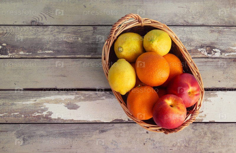 Корзина с апельсинами, нектаринами и лимонами на старом деревянном фоне