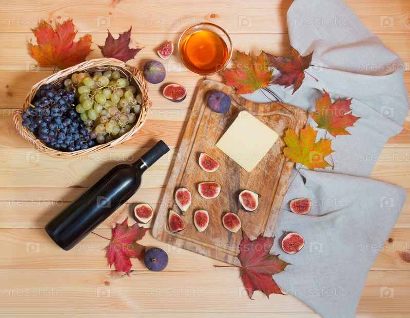 Бутылка красного вина, инжир, сыр, гроздья винограда, мед и осенние кленовые листья на деревянном столе