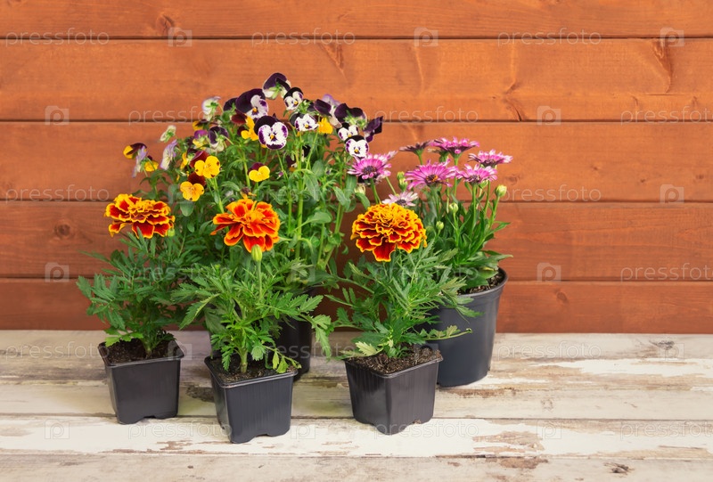 Набор саженцев цветов анютиных глазок, бархатцев и остеоспермума на старом деревянном столе. Выборочный фокус