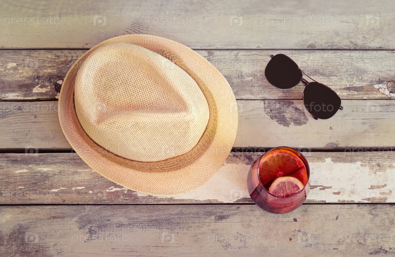 Шляпа, солнцезащитные очки и стакан сангрии на старом деревянном фоне