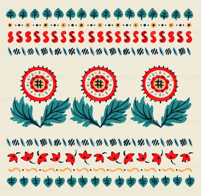 Набор этнических элементов. Бордюр представляет собой полосу с цветами, листьями, ветками, вензелями. Народная вышивка. Славянский, украинский, русский мотив. Хохлома, матрешка, дымковская игрушка. Мексиканский, индийский, цыганский ковер. Вязаное кружево
