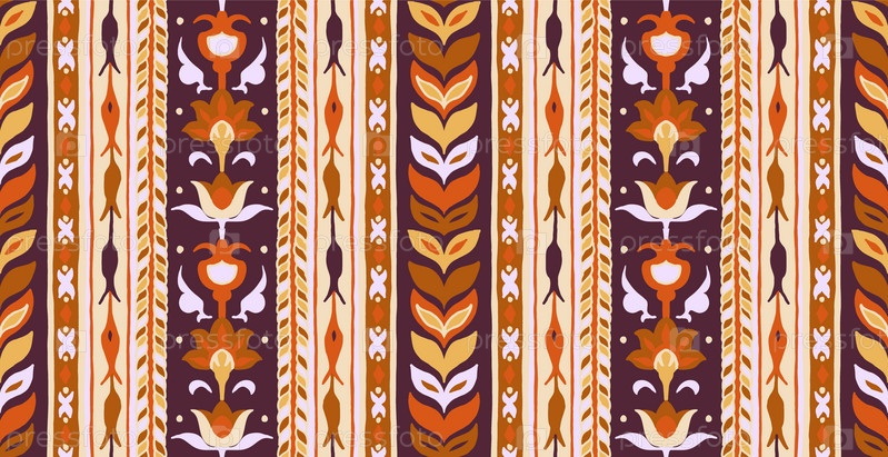 Геометрический дамасский орнамент. Икат границы. Этническая вышивка с листьями и монограммами. Племенная векторная текстура. Бесшовный народный узор в ацтекском стиле. Индийский, скандинавский, цыганский, мексиканский, африканский ковер