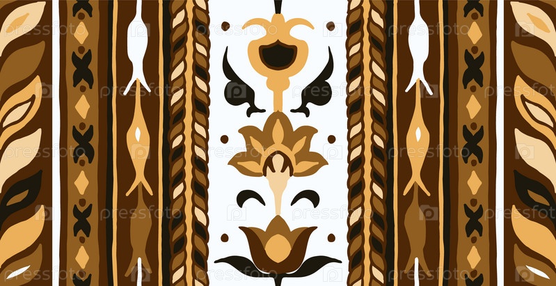 Геометрический дамасский орнамент. Икат границы. Этническая вышивка с листьями и монограммами. Племенная векторная текстура. Бесшовный народный узор в ацтекском стиле. Индийский, скандинавский, цыганский, мексиканский, африканский ковер