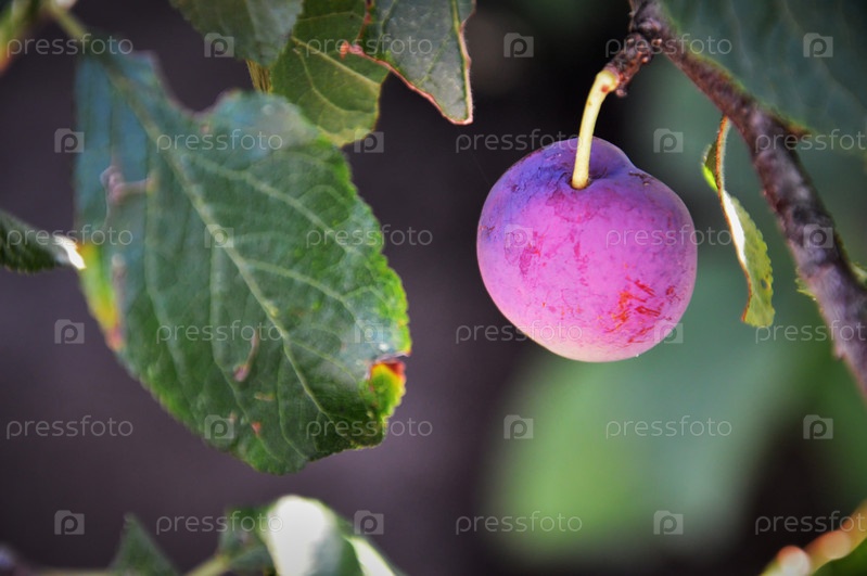 Одна незрелая слива красного цвета на дереве крупным планом, выборочный фокус, размытый фон зеленых листьев