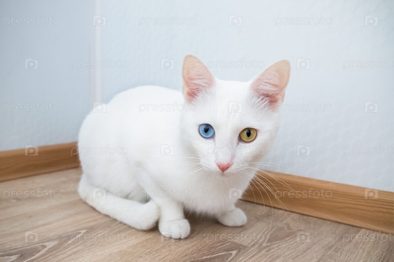 Белый кот с разноцветными глазами, синий и желтый глаз