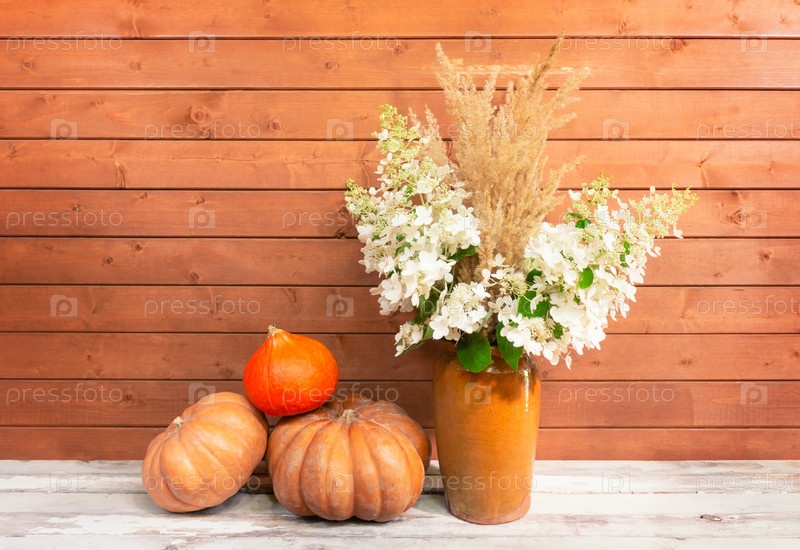 Белые цветы гортензии и сухая трава в глиняной вазе и тыквы на старом деревянном столе